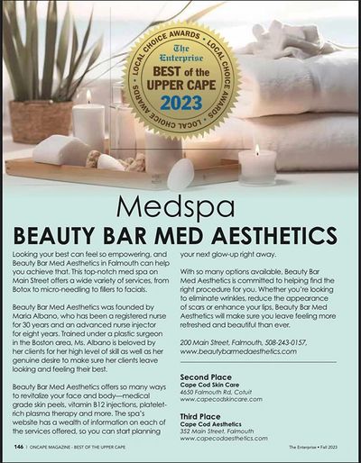 We’re thrilled to announce that Beauty Bar Med Aesthetics has been honored with the Local Choice Award for "Best of the Upper Cape" by OnCape Magazine! This award is a testament to our dedication to excellence in med spa services and our commitment to enhancing our clients' beauty and wellness. Thank you for your trust and support!